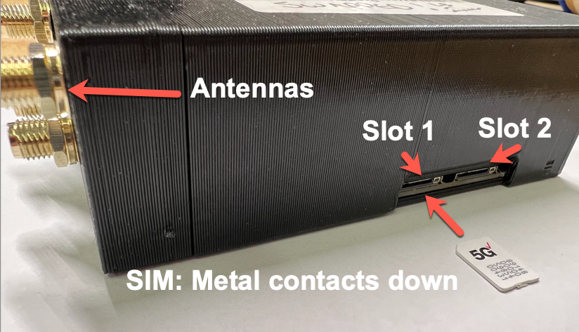 Insert your SIM metal contacts down (as pictured below) in Slot 1. Slot 1 is the closest to the antenna ports or front of the modem.