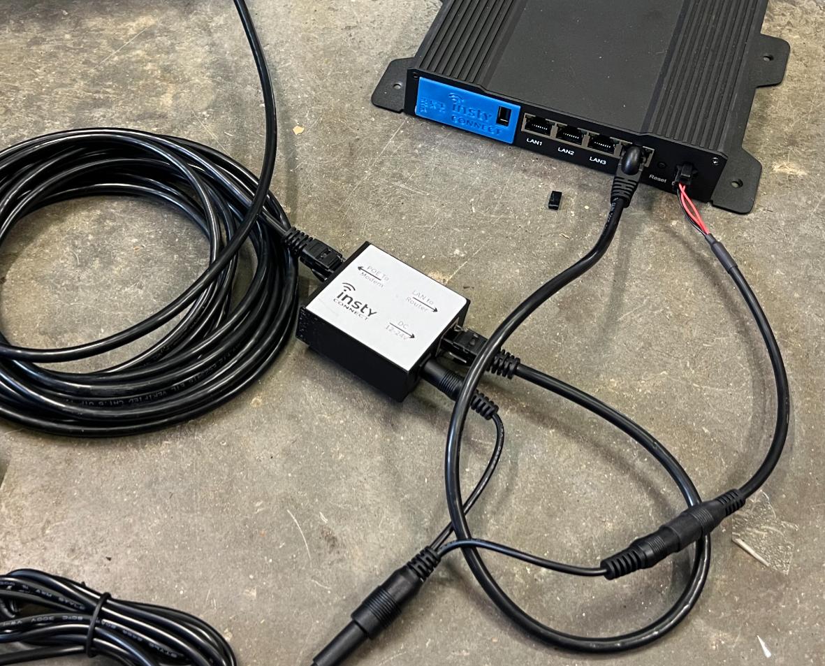 The POE Injector with short wire going to the WAN port and long wire to the Antenna.