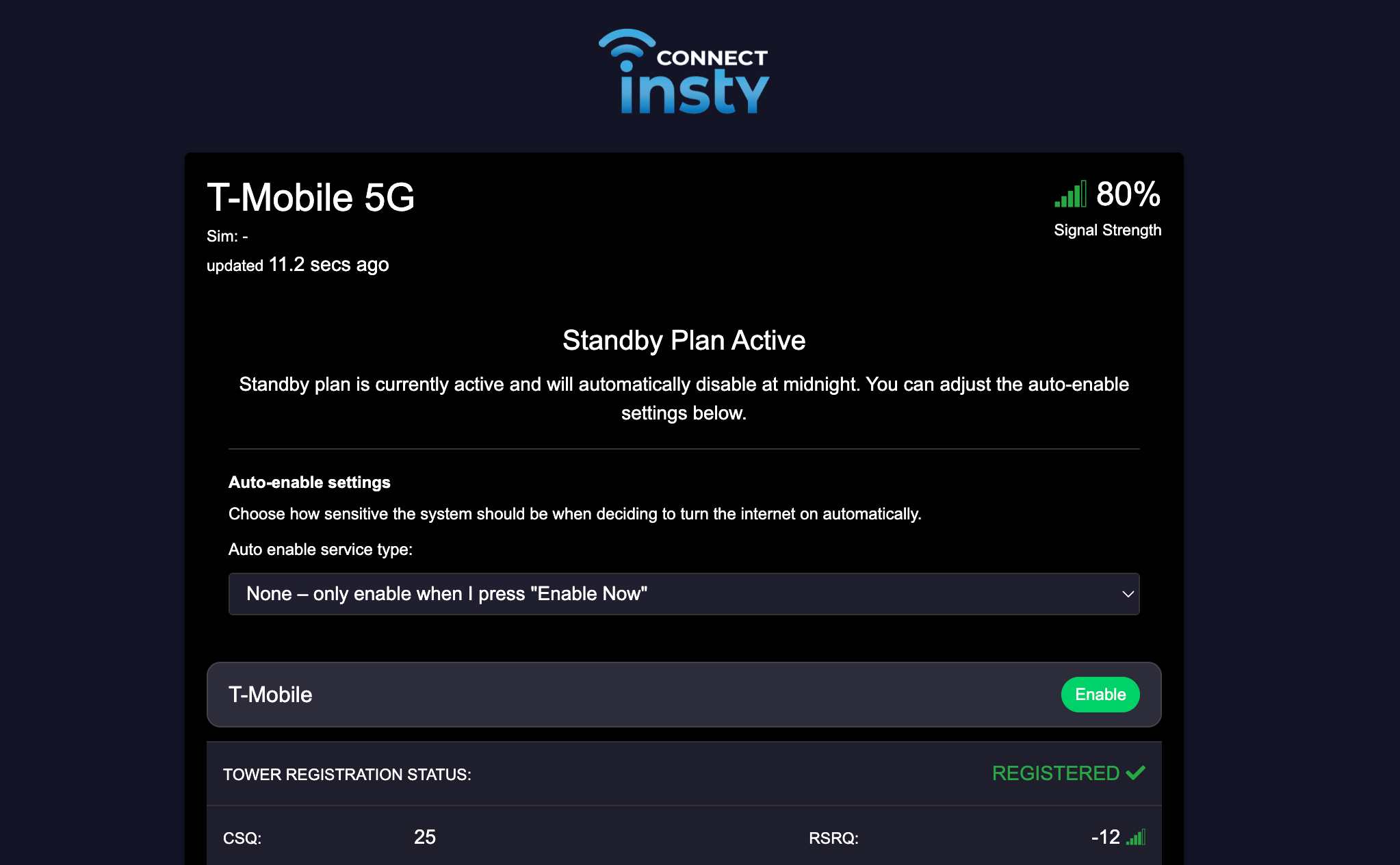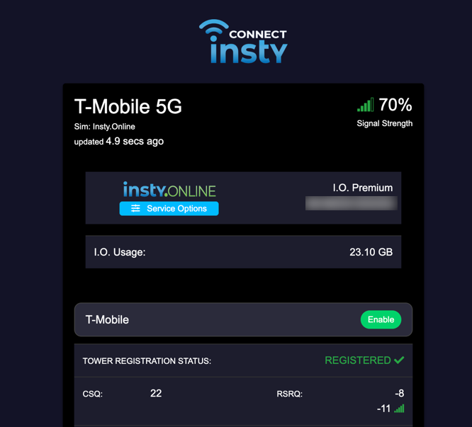 If you have Insty.Online and do not have a connection to the internet, please check your signal in the dashboard to make sure you are registered on a tower.