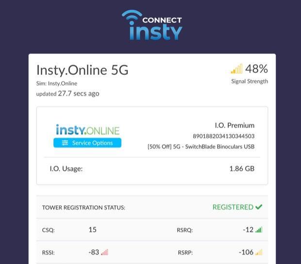 If you have Insty.Online and do not have a connection to the internet, please check your signal in the dashboard to make sure you are registered on a tower.