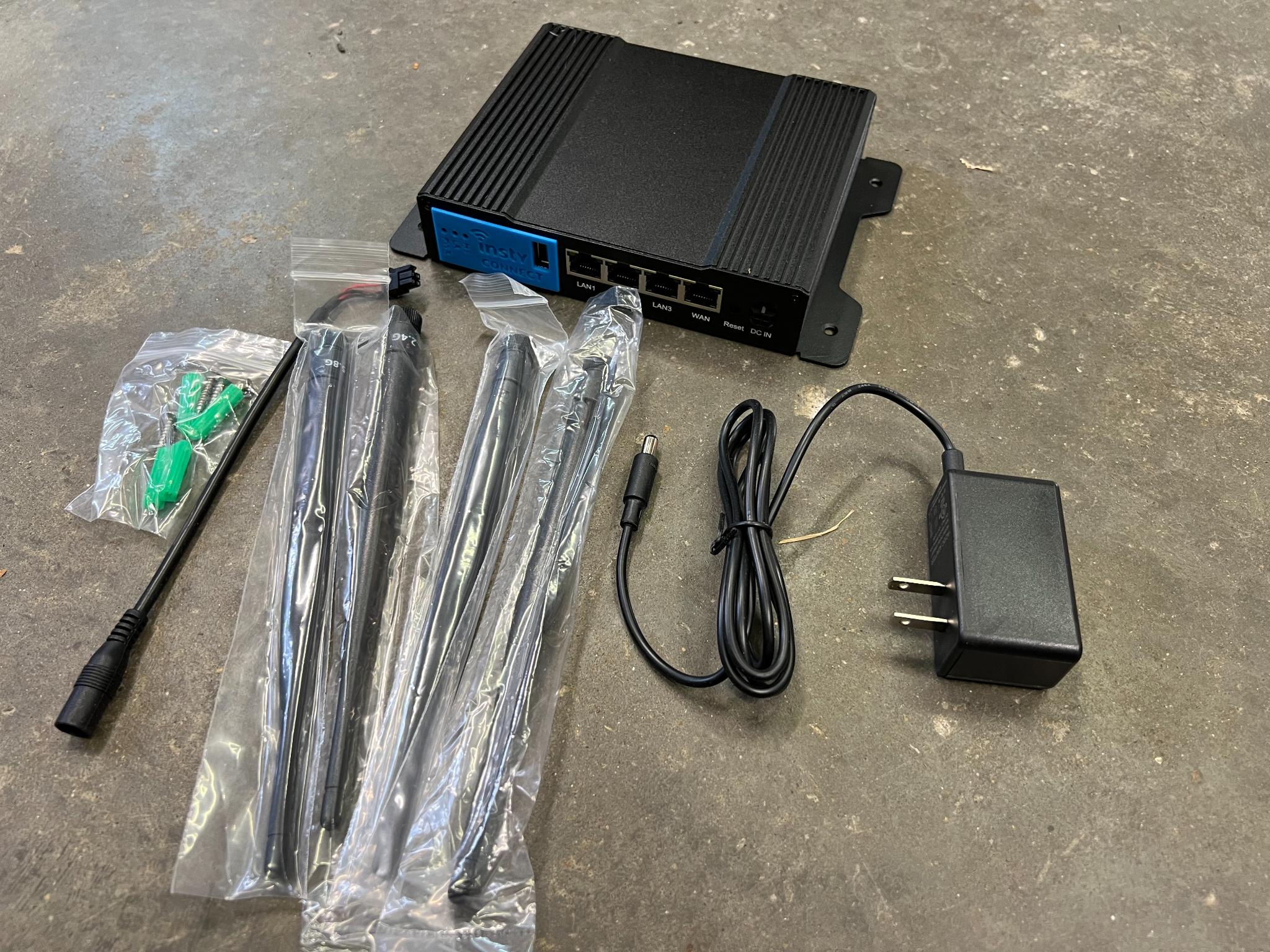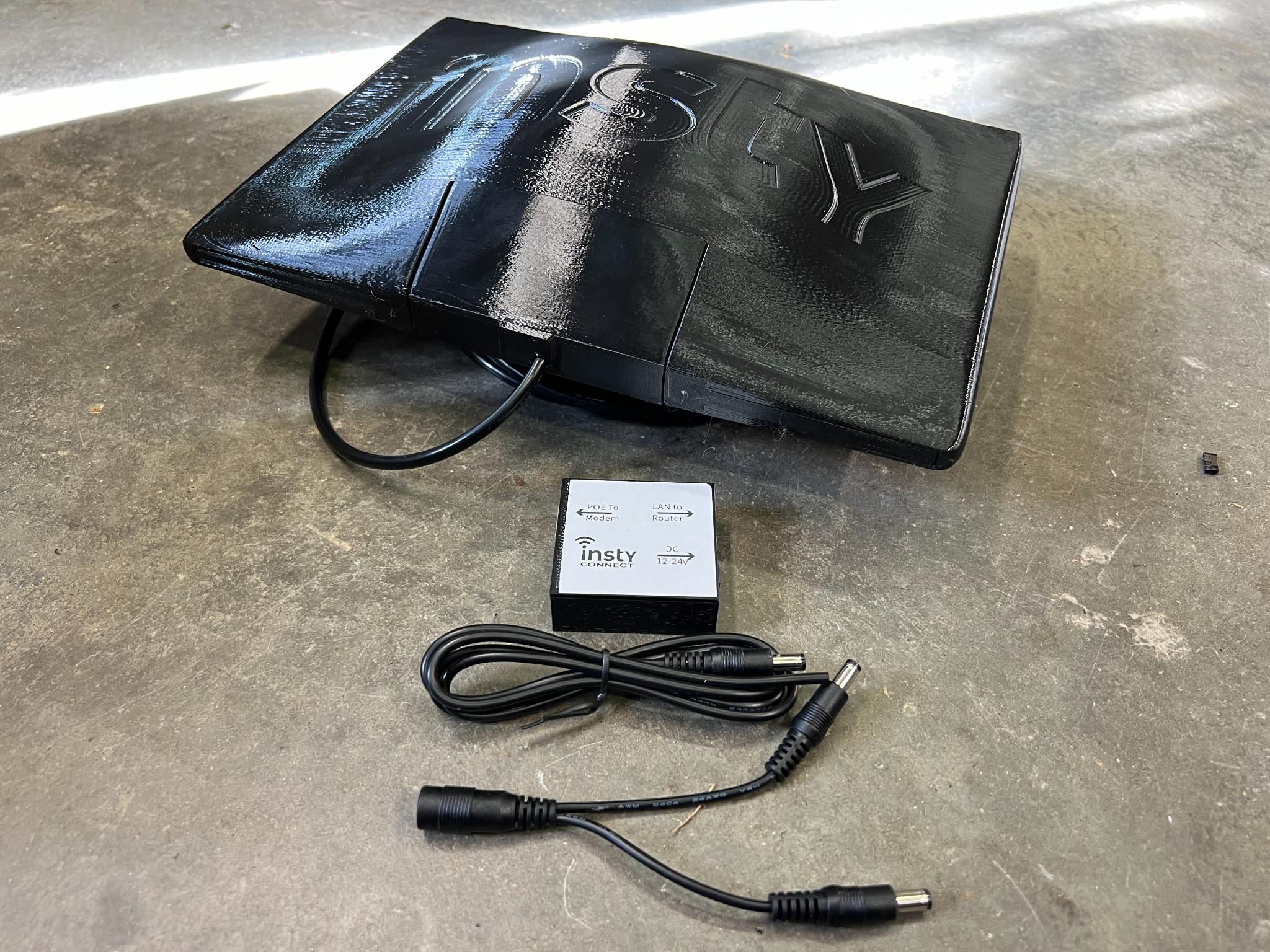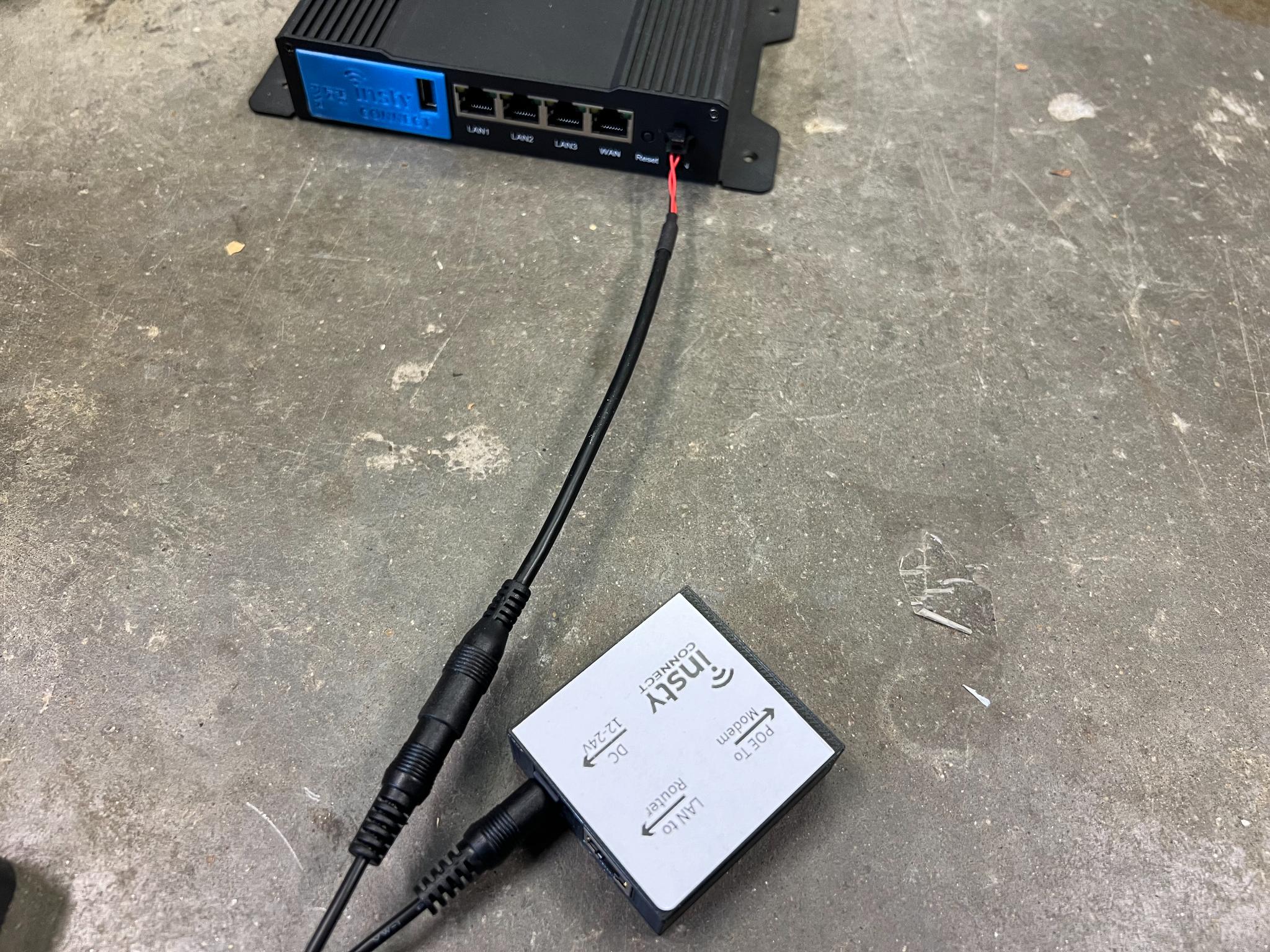 The POE Injector with short wire going to the WAN port and long wire to the Antenna.