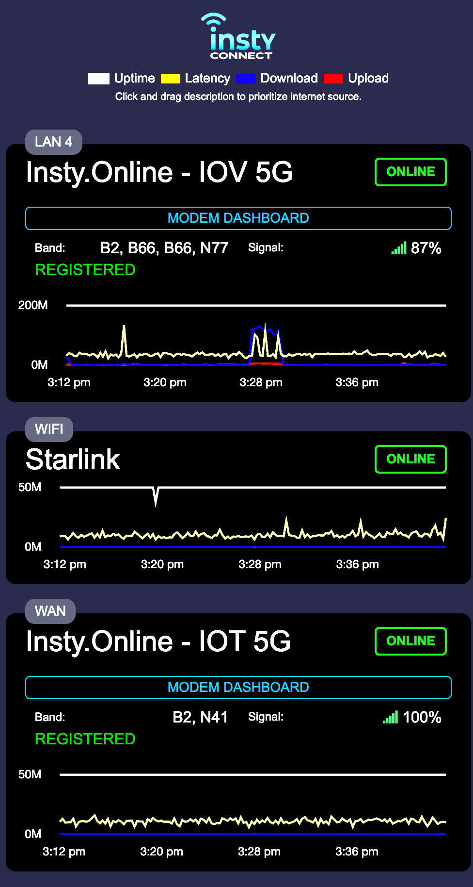 The quick dashboard is to show you how the internet is working on the internet sources that are connected to the Insty Gen 2 router.