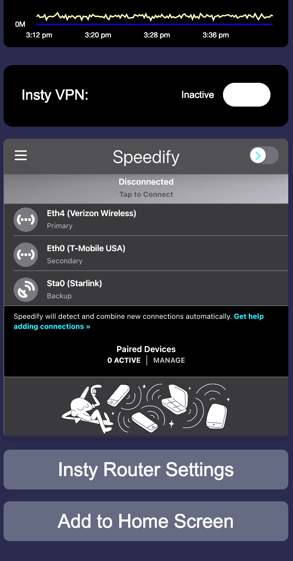 Speedify: Speedify is a third party internet bonding and failover service, similar to Insty VPN but with a few more features. It can bond the connections together for a very secure connection, and while using, you may not experience any lag when changing internet sources. This is a pay for service provided by Speedify, you must have a Speedify account to utilize this service.