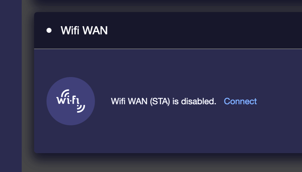 It's simple to connect to a Wifi source. From the Internet menu, find the Wifi WAN box, and click the Connect button.