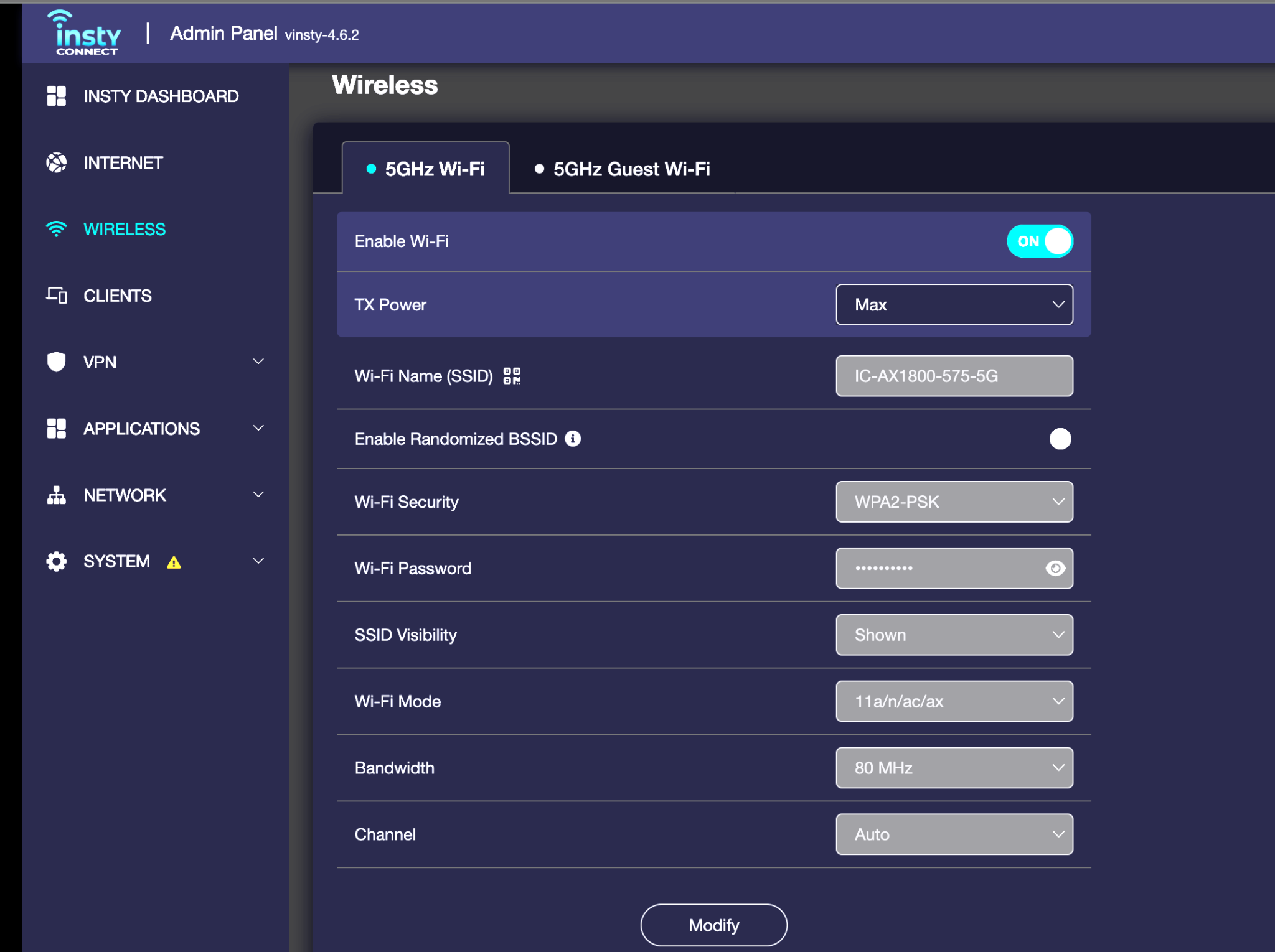 To make changes to your wifi settings, click the 'Modify' button and then change the settings as you need.