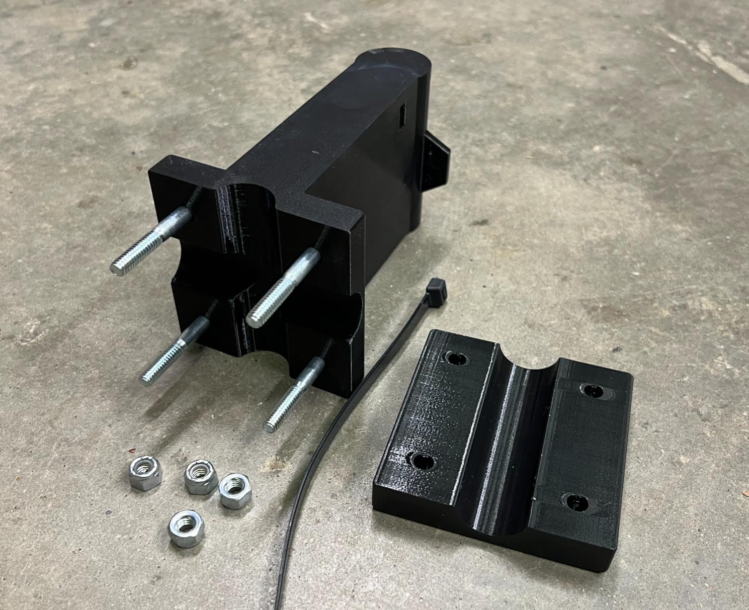 The ladder mount includes the mount, backing plate, bolts, locking nuts, and a zip tie.